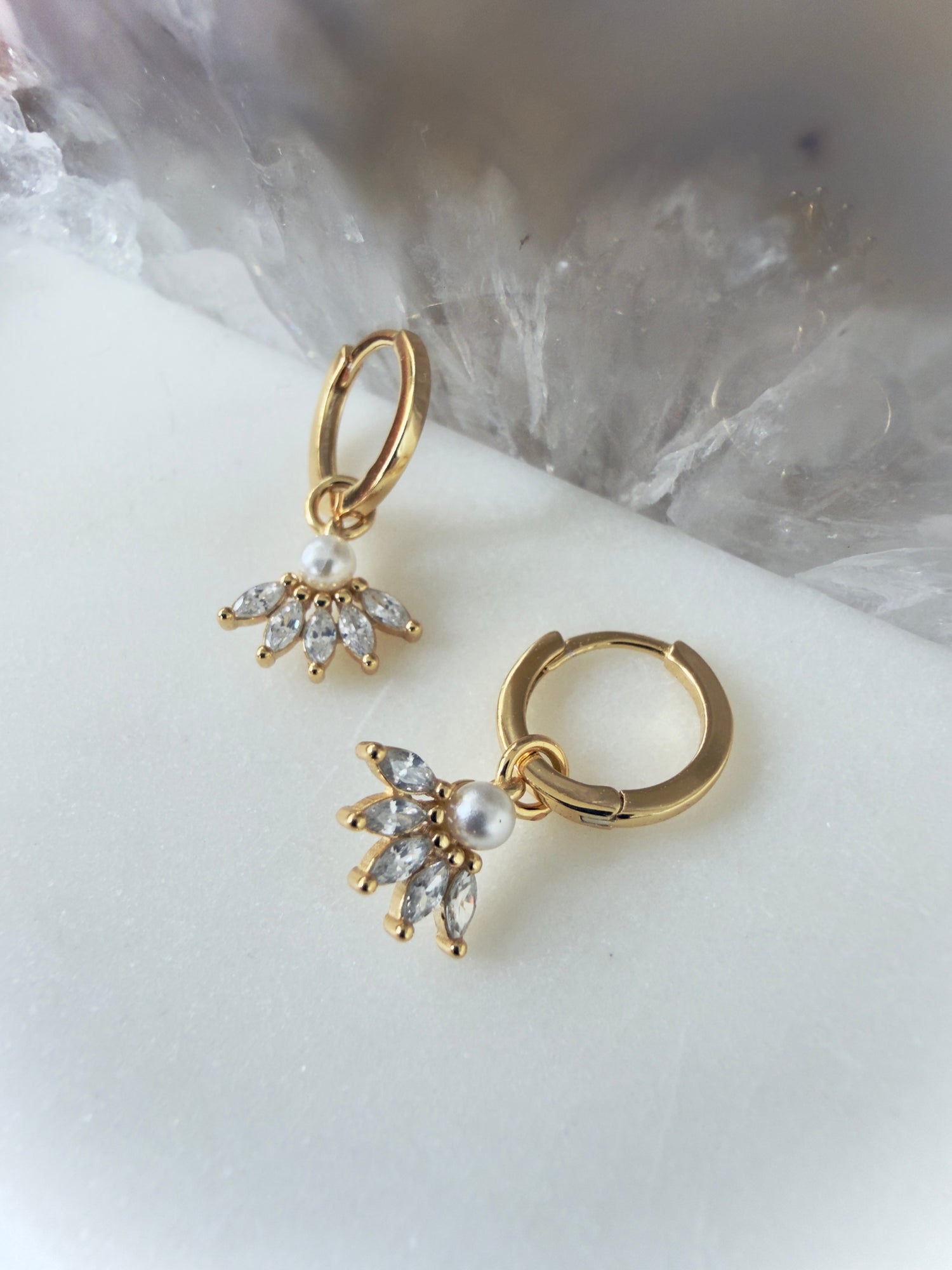Gold Huggie Earrings with Pearl and Sparkling Flower Drop